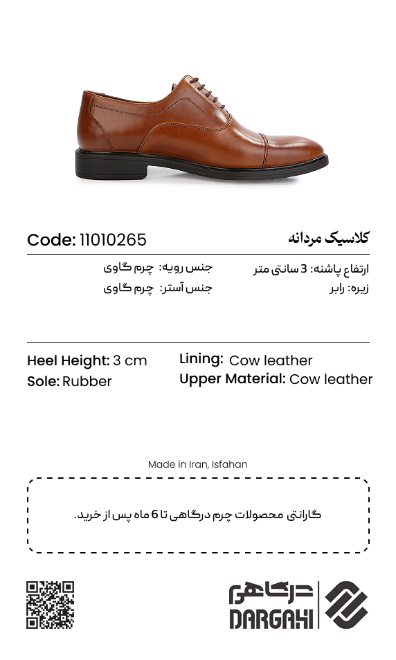 کفش مرسدس از پر فروش ترین محصولات برند درگاهی است که دارای ویژگی هایی همچون: زیبایی، شیک بودن، راحتی، رسمی بودن و مقاومت بالا می باشد. جنس آستر کفش از نوع چرم است که دارای کیفیت بالایی می باشد.