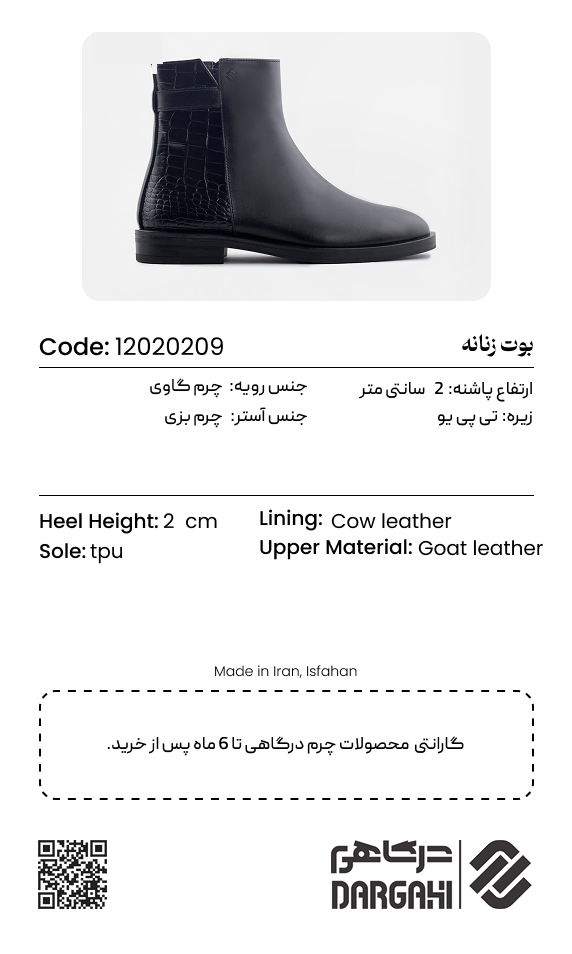 کفش بوت زنانه چرم درگاهی،زیرهی TPU با دوام و استحکام بالا طراحی شده و انتخابی ایدهآل برای استفادهی طولانیمدت است.این زیره با انعطافپذیری و خاصیت ضدلغزش، ثبات و امنیت حرکت را تضمین کرده و تجربهای مطمئن و راحت در هر قدم فراهم میکند.رویهی بوت از ترکیب چرم طبیعی شبرو و کروکو ساخته شده است،چرم شبرو با جلوهای نیمهمات و لطیف، ظاهری کلاسیک و شیک ایجاد میکند،و چرم کروکو با بافت الهامگرفته از پوست کروکودیل و درخشش ظریف خود، حسی لوکس و خاص به استایل شما میبخشد.