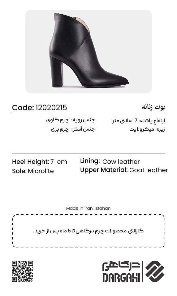 کفش بوت زنانه چرم درگاهی،زیرهی میکرولایت در کفشهای چرم درگاهی با ساختاری سبک، منعطف و بادوام طراحی شده است تا در هر قدم راحتی و پایداری را فراهم کند.طراحی ضدلغزش و مقاوم این زیره، حرکت شما را ایمن و مطمئن کرده و تجربهای سبک و دلپذیر از پیادهروی ارائه میدهد.رویهی بوت از چرم طبیعی شبرو ساخته شده است؛ چرمی نیمهمات و لطیف که ظاهری کلاسیک، شیک و همیشهبهروز به استایل شما میدهد.ترکیب فرم بوت با چرم طبیعی، آن را به انتخابی ایدهآل برای فصول سرد و استایلهای شهری تبدیل کرده است.