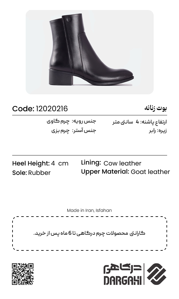 کفش بوت زنانه چرم درگاهی،زیرهی رابر با مقاومت بالا و خاصیت ضدسایش، انتخابی مطمئن و بادوام برای استفادهی روزمره و مسیرهای شهری است.چسبندگی عالی آن، ثبات و ایمنی گامها را تضمین کرده و تجربهای راحت و قابل اعتماد از هر قدم فراهم میکند.رویهی بوت از چرم طبیعی شبرو ساخته شده است؛ چرمی نیمهمات و لطیف که جلوهای کلاسیک، شیک و همیشهبهروز دارد.