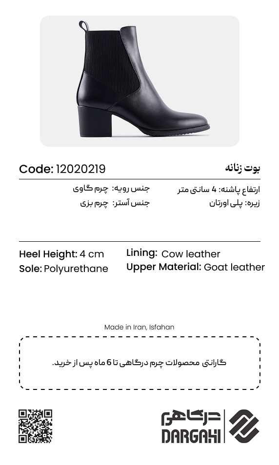 کفش بوت زنانه چرم درگاهی با طراحی شیک و راحت، انتخابی ایده‌آل برای پیاده‌روی‌های طولانی و استایل کلاسیک است.زیره پلی‌یورتان: ترکیبی از سبکی، انعطاف و دوام بالا؛ با خاصیت ارتجاعی، هر قدم را نرم و راحت می‌کند و فشار وارد بر پا را کاهش می‌دهد. طراحی ضدلغزش، ایمنی حرکت را در مسیرهای مختلف تضمین می‌کند و تجربه‌ای مطمئن از پیاده‌روی به شما می‌دهد.رویه،چرم طبیعی شبرو با سطح نیمه براق که ظاهری کلاسیک، شیک و همیشه به‌روز به استایل شما می‌دهد.