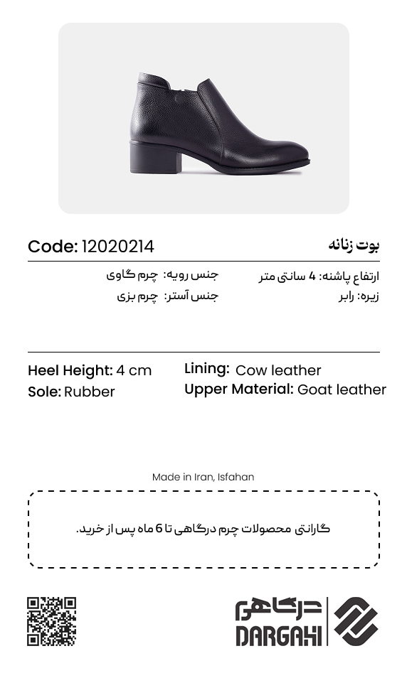 کفش بوت زنانه چرم درگاهی با طراحی شیک و ساختاری مقاوم، همراهی مطمئن برای استفاده روزمره و فصل‌های سرد است.زیره‌ی رابر این مدل، به دلیل مقاومت بالا و خاصیت ضدسایش، انتخابی ایده‌آل برای مسیرهای شهری محسوب می‌شود. چسبندگی عالی این زیره، ثبات و ایمنی حرکت را تضمین کرده و دوام طولانی‌مدت آن، تجربه‌ای قابل اعتماد و راحت از هر قدم را فراهم می‌آورد.رویه‌ی کفش از چرم طبیعی فلوتر ساخته شده است؛ چرمی با سطح مات که جلوه‌ای شیک، مدرن و ماندگار به استایل شما می‌بخشد.